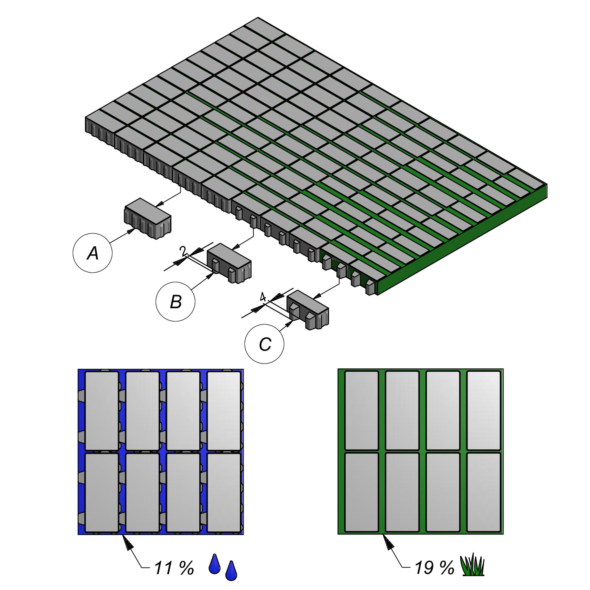 Avec ses joints de 2 cm de largeur, les dalles drainantes Eco Solution Greenstone 2.0 évacuent facilement l'eau dans le sol. Grâce aux assemblages à tenons et mortaises, les dalles gazon sont inébranlables. Elles s'utilisent pour les allées et parking, même pour les circulations plus lourdes. Choisissez de remplir les vides de gazon (plus de verdure) ou de pierrailles ou gravier (plus perméables). Avec un sous-sol qui favorise l'infiltration, l'évacuation de l'eau sera optimale. A combiner avec le Seamstone pour une transition organique entre les pavés ordinaires et les revêtements drainants. Les Seamstone ont un joint étroit de 6mm et se raccordent parfaitement aux tenons de 6mm du pavé drainant Greenstone. La combinaison des différents formats du Greenstone, et du Greenstone avec le Seamstone ét le Grasslines Small permettent de réaliser des dessins créatifs, la solution idéale pour un parking accessible.